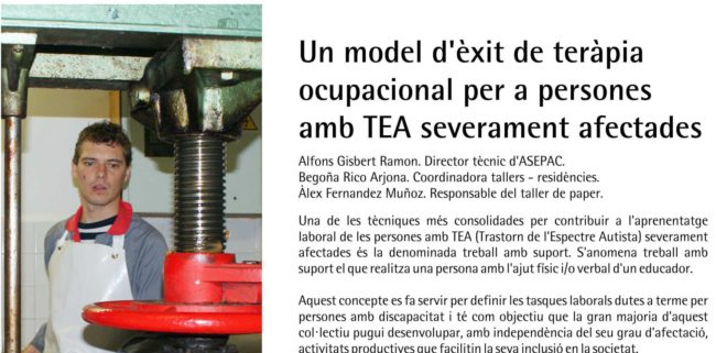 A partir d’aquest dilluns està disponible el número 4 de “monografies” dedicat a la teràpia ocupacional. Una de les tècniques més consolidades per contribuir a l’aprenentatge laboral de les persones amb TEA (Trastorn de l’espectre autista) severament afectades és la denominada treball amb suport. Es diu treball amb suport el que realitza una persona amb l’ajuda física…
