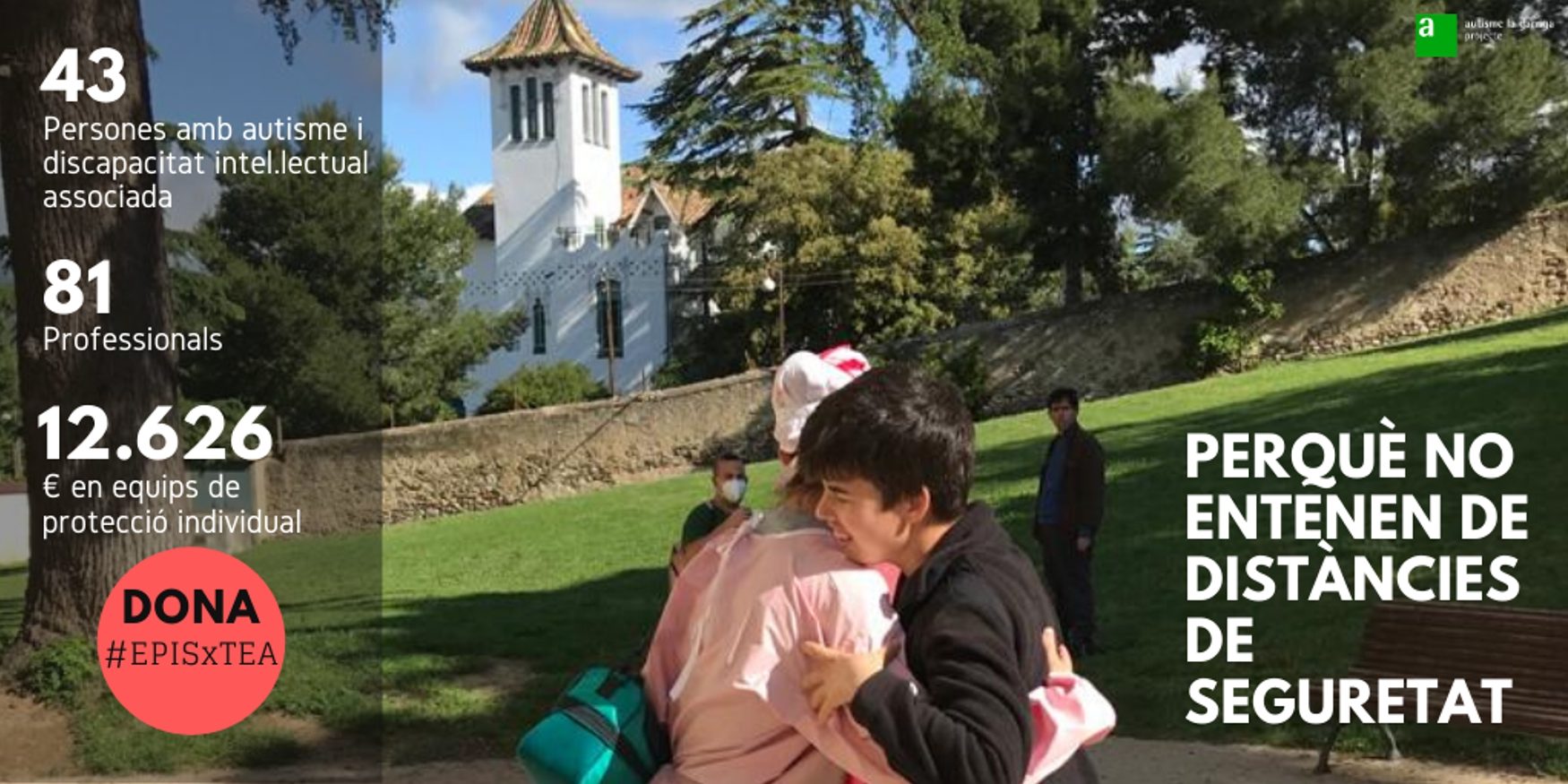 És difícil no poder abraçar les persones que estimes quan les tens a la vora. Però ara és el que toca, per responsabilitat, per solidaritat, per la salut de tots, per lluitar contra la COVID19. La Júlia, en Sergio i els seus companys d’autisme la garriga no entenen de distàncies de seguretat. Estan greument afectats per l’autisme. Els equipaments de protecció individual són l’element imprescindible per a ells i per als professionals que els atenen.
